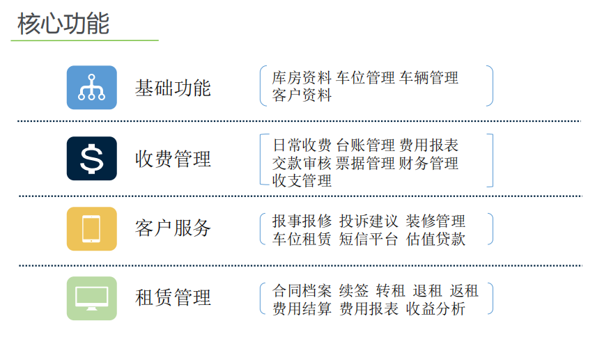 智慧物業(yè)適用于: 智能化公寓、產(chǎn)業(yè)園綜合體、商業(yè)綜合體 工業(yè)園區(qū)/辦公園/孵化園/創(chuàng)業(yè)園/科技園/物流園 寫字樓/辦公樓/專業(yè)市場。以物業(yè)管理系統(tǒng)為平臺,打通移動手機(jī)端、智能物聯(lián)、物業(yè)管 理后臺,實現(xiàn)智慧園區(qū)管理的綜合信息化平臺。